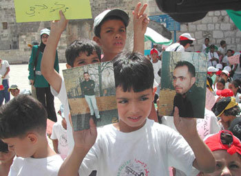 8日,巴勒斯坦孩子们举起推测为在伯利恒被以色列当局关押的人的图片,举行要求释放他们的示威。