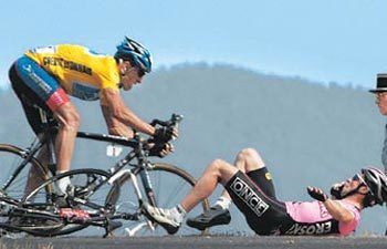 15日(韩国时间),阿姆斯特朗在法国加普山区(184.5公里)进行的第9赛段比赛上度过事故危机,连续两个赛段保持着总成绩第1的位置。在离终点尚有4公里的急下坡路上,由于前面的贝洛基(西班牙)突然摔倒,使阿姆斯特朗险些与其撞在一起,但他最终化险为夷。因此次事故,上届比赛排名第二位的阿姆斯特朗的最大竞争对手贝洛基由于右腿和手腕骨折,放弃了剩余赛程。