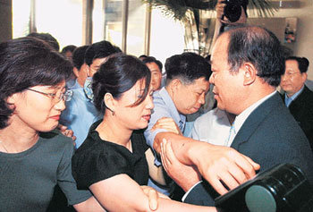 16日,农林部长官金泳镇(右)抗议法院就新万金事业做出的决定,宣辞职后,欲离开政府果川大厦时,100多名农林部职员请求撤回辞职,并阻止其离开。