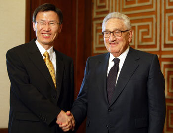 26日,前美国国务卿基辛格(右)与外交通商部长官尹永宽在汉城汉南洞外交通商部公馆正在握手。当天,二人就北核问题等最近的悬案交流了意见。