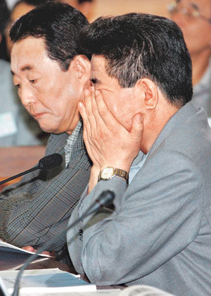 2日,出席在汉城世宗路政府中央办公大楼附馆举行的“第二次国政讨论会”的卢武铉总统脸上露出了疲惫的表情。