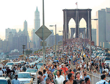14日(当地时间),因停电一下子跑出美国曼哈顿市中心建筑的纽约市民们与汽车队伍融在一起正在走过布鲁克林大桥。