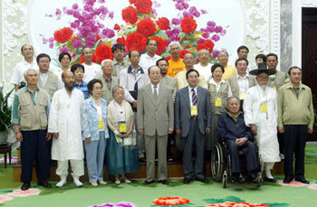 8.15民族大会举行第三天的16日,南方、国外代表团在平壤万寿台大会堂会见了北韩最高人民会议常任委员会委员长金永南(中)并合影留念。