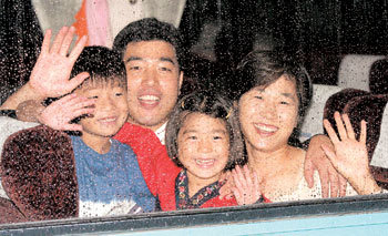 无论生活如何疲惫,回乡的心情总是快乐无比。9日上午在汉城车站乘坐回乡列车的一家人正在以欢快的表情挥手。