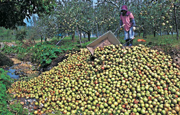 17日,在庆北浦项市北区杞溪面的一个果园中,农民正在把台风“鸣蝉”刮落的苹果堆起来。