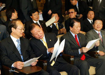 李富荣议员(左侧)等统一新党推进议员们于19日在国会图书馆讲堂中举行议员总会。在选出院内代表之前,互相交谈。