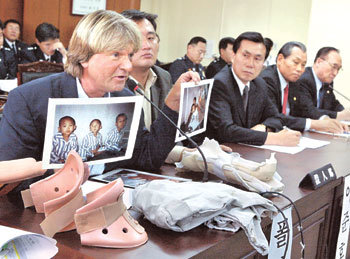 北韩记者们与保守团体的会员们在大邱大运会发生冲突时负伤的德国逃北者人权活动人士沃勒森于23日以证人的身份出席汉城警察厅国政监察场所,说明北韩人权实际状况和负伤当时的情况。
