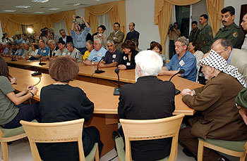 5日,以阿拉法特为首的巴勒斯坦自治政府(右侧)在约旦河西岸城市拉马拉的办公室中举行国际和平活动家会议,正在表示为防止自杀性爆炸事件做出努力。阿拉法特针对以色列空袭叙利亚事件在当天宣布进入紧急状态,并组成了由8名人员的非常内阁。