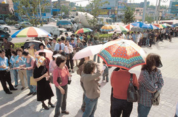 从6日开始接受预购申请的蔚山中区药泗洞PRUGIO公寓样品房前,前来预购的人排起了长龙。在他们旁边准备购买转让权的无照房地产中介者竖起了旱伞。