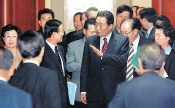 12日,结束在汉城钟路区世宗路政府中央大厅举行的座谈会后,国务总理高建(中)等国务委员们正在步出会议场。