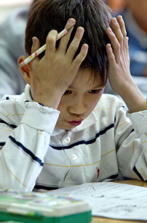 15日,汉城小学3年级学生考完2003年基础学历评价考试后,汉城西大门区美芹洞美洞小学一位学生看着考试卷做出了苦恼的表情。