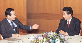 26日下午,卢武铉总统(右)与大国家党代表崔秉烈正在青瓦台举行领袖会谈。