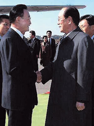 29日,中国“二把手”全国人大常务委员长吴邦国(左)抵达平壤机场,开始了对北韩的访问。因为吴邦国是中国国家代表团团长,所以有人认为金正日国防委员长会亲自迎接,但是当天到机场迎接吴邦国的是最高人民会议常任委员长金永南(右)