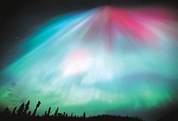 29日,阿拉斯加上空被极光所笼罩。随着太阳爆发超大型黑子之后产生的强烈磁暴抵达地球,在北欧和美国北部等地都观测到了这种极光。磁暴虽然对人体没有直接危害,但是对卫星电子装置等有很大影响。