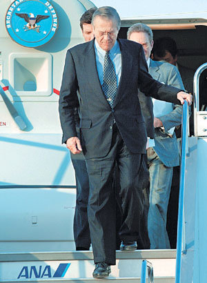 自2001年1月就任国防部长以来,首次巡访亚洲国家的美国国防部长拉姆斯菲尔德于14日经关岛抵达日本东京羽田国际机场。拉姆斯菲尔德计划访问日本和韩国,并讨论向伊拉克派兵、重新部署驻海外美军以及北韩核武器等问题。