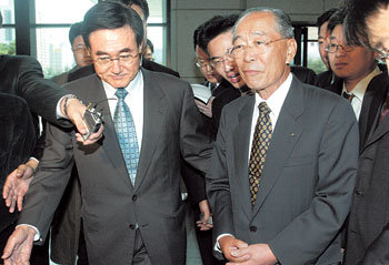 강신호 전국경제인연합회 회장대행(오른쪽)이 19일 송광수 검찰총장을 만나 기업 비자금 수사를 조속히 마무리해 달라고 요청했다. 강 회장은 이날 오후 현명관 부회장(왼쪽)과 함께 서울 서초구 대검찰청을 방문했다.