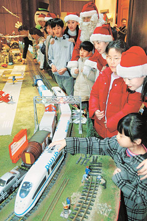 23日,汉城中区南大门路5街希尔顿酒店1楼大厅以圣诞节作为主题设置了120多台的小型火车。小朋友们与这位装扮成圣诞老人的酒店职员一起正在以好奇的目光观看火车。此次活动将举行到12月末。