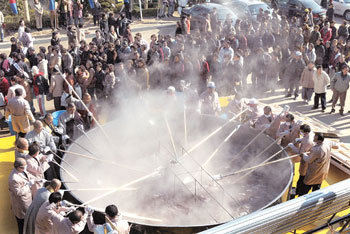 22日(冬至),在釜山市釜山镇区的草邑洞三光寺,大师和信徒们正在直径5米、高1米的超大型锅里煮着小豆粥。当天煮的粥可供4.2万人食用,共用了55锅大米和25锅小豆。
