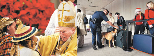 25日圣诞节,与往年一样,教皇保罗二世(右)在梵蒂冈举行了圣诞弥撒。但由于恐怖威胁,包括美国洛杉矶机场在内的美国和欧盟,均发布了警戒令。