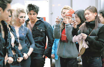 11日上午,在汉城明洞街头举行了Levis时装展。市民们正在用数码摄像机拍摄身穿牛仔服并解开胸前纽扣的浓妆模特。