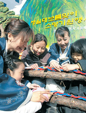 5日,迎正月十五在汉城钟路区仁寺洞文化广场举行了把写有新年愿望的纸条夹在用青、红丝线编的福绳中的活动。在服务人员的帮助下,小朋友们正在兴高采烈地把写有愿望的纸条夹在福绳中。