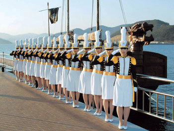13日,海军士官学校举行第62期新生开学仪式前一天,16名女生正在停靠在庆南镇海市前海的龟船前行军礼。