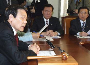 16日,民主党代表赵舜衡(左)正面攻击了卢武铉总统。因为卢武铉总统曾表示,希望宽大处理牵连于非法选举资金的企业家。赵舜衡当天批评说:“(该发言)侵犯了法务部长官和检察总长对调查的固有权力。”