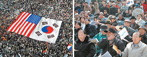 1日,保守阵营在汉城市政府前的广场(左)举行了集会,而进步阵营在汉城钟路3街塔公园举行了集会。保守阵营高呼“韩美合作”,而进步阵营高呼“民族自主”,进步和保守势力之间的矛盾就是我们社会的一个缩影。