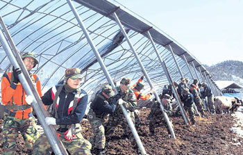 7日,陆军第32师团的官兵在忠南燕歧郡西面气龙里井洞牧场(音译)进行了恢复因暴雪倒塌的牲畜棚的工作。继5、6日进行支援后,军队在当天又投入3万多人对受灾的农民和道路进行了支援。