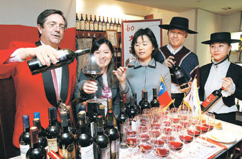 在下月1日韩国-智利自由贸易协定(FTA)生效之际,智利驻韩国大使费尔南多·休密特(左)亲自出面宣传智利产葡萄酒。由一家葡萄酒进口企业主办的“智利葡萄酒展”于15~18日在汉城江南区三成洞的葡萄酒专卖店LE CLUB DE VIN韩国贸易中心店举行,在此次展会上,56种智利葡萄酒最高可打折39%。