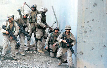 图为为搜查毁坏美国平民尸体的罪犯,正在向巴格达以西的费卢杰进军的美国海军陆战队第一联队第二大队的官兵。由于自停战后,目前伊拉克事态最为严重,所以美国总统乔治·W·布什7日组织召开了国家安全会议。