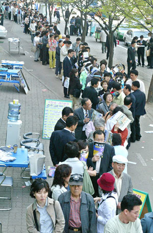 订购商住两用住宅的热潮从汉城龙山区的“城市公园”刮到了京畿富川市的中洞。14日,在中洞LG百货店对面推出的“富川斗山组合包厢”样品房前,购房者排成了长达一公里的队伍。