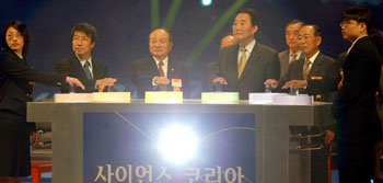 고건 대통령 권한대행 국무총리(왼쪽에서 네 번째)가 21일 서울 삼성동 코엑스에서 열린 과학의 날 기념식에 참석해 과학기술 입국 추진을 위한 사이언스 코리아 선포 기념 버튼을 누르고 있다. 정운찬 서울대 총장(왼쪽에서 두 번째), 오명 과학기술부 장관(왼쪽에서 세 번째), 강신호 전국경제인연합회 회장(오른쪽에서 두번째)의 모습이 보인다.