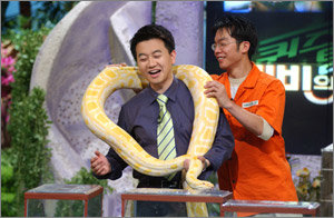 “如果你了解蛇,就会发现蛇是一种有魅力的动物。把蛇缠在身上感觉一下,如果是夏天会更好。这让我想起了过去,一条5米长的缅甸白蛇缠着我不放,吓得我流了一身汗。”(主持人申荣一)