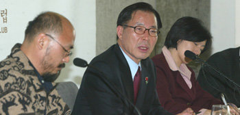 23日,民主劳动党代表权永吉(中)正在汉城中区太平路韩国新闻中心举行的邀请外电记者团的新闻发布会上回答记者提问。在第17届议会选举中取得飞跃的民主劳动党连日来切身体会到了不同于往日的地位。
