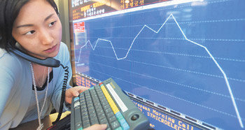 29日,受“中国冲击”影响,股市暴跌。随着中国总理温家宝提到实行减缓政策的必要性,再加上外国投资者的收购势头,综合股指与前一天相比下跌26.42点,KOSDAQ指数暴跌22.66点。在位于汉城钟路区世宗路东亚媒体中心的彭博社韩国分社,一位职员正在注视股指曲线。