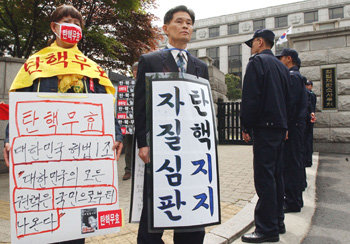 30日,正在审理卢武铉总统弹劾案的汉城钟路区才洞宪法裁判所前,赞成弹劾和反对弹劾的人并排举行“单人示威”。