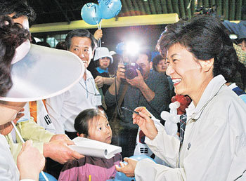2日,大国家党代表朴槿惠参加在汉城瑞草区良才洞“市民丛林”举办的步行活动,正在给支持者签名。当天,在由“热爱朴槿惠的人们的组织”等团体共同举办的活动上,朴槿惠与支持者们一同高唱大众歌曲等度过了愉快的时光。