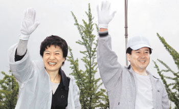 9日,开放的我们党议长郑东泳(右)和大国家党代表朴槿惠出席从汉城蚕室综合运动场出发的“京乡报社汉城马拉松大赛”,正向参加者挥手。该马拉松大赛由京乡报社主办。当天,他们两人没有说多少话,仅表示了慰问。