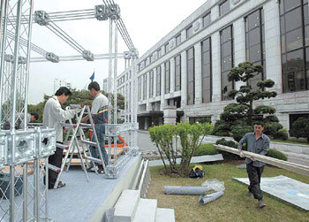 11日,随着宪法裁判所发表允许媒体直播宪法裁判所对总统弹劾案的判决过程,各电视台职员们在宪法裁判所前正在设置夜间直播用设施。