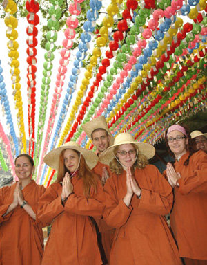 外国佛教徒合掌的情形别具一格。18日,参加在汉城钟路区坚志洞曹溪寺举行的“佛陀活动”的外国人展开志愿者活动,而且还参加了燃灯制作活动。