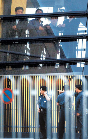 1日,逃北者暂避的中国北京德国学校附近的紧张形势。学校内的逃北者们(上)正在以焦虑的表情注视着窗外。外边中国警察戒备森严(下)。