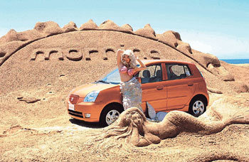 起亚汽车公司在13日釜山海云台举行的“沙雕节”中,在刻画海底风景的巨型沙雕背景前展示了1000cc排量的小型轿车Morning。
