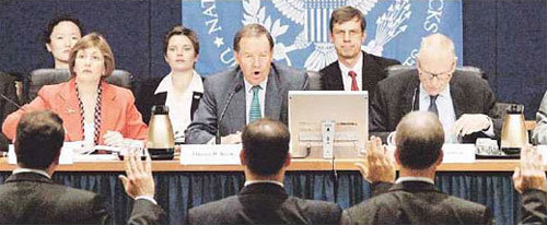 “9·11恐怖事件”真相调查委员会16日表示,未发现伊拉克协助基地组织实施“9·11恐怖袭击事件”的证据。图为在发表这一结果之前,出席听证会的前任和现任情报官员、法律部门负责人正在进行发言。