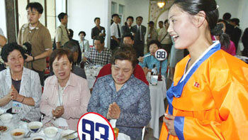 12日是第10次南北离散家属相逢的第二天,一名身着韩服的北韩向导(右)正在金刚山金正淑休养所的午餐场所唱歌。当天,南北离散家属举行了个别相逢活动。