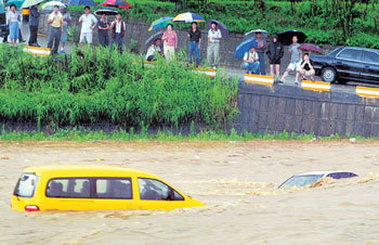 16日,包括首都地区在内的中部地区下起了降水量最高达50毫米的集中暴雨,导致道路被淹没等严重灾害。图为停在忠北清州市无心川河边道路上的汽车被突然上涨的河水冲下去的情景。