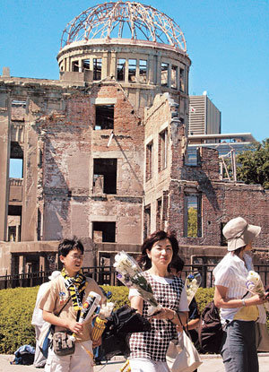 图为在6日举行第59届原子弹爆炸牺牲者追悼仪式之际,5日来到日本广岛和平追悼公园的日本人家属。后面是因原子弹爆炸遭到破坏的圆顶屋建筑物。