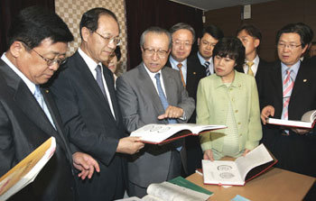 11日,在汉城中区双林洞高句丽研究财团举行的国会教育委员会上,委员长黄佑吕(左2)等朝野议员正在听取高句丽研究财团董事长金正培(中)对最近发行的中国历史教科书的说明。