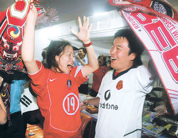 反复出现紧张刺激的深夜足球赛暂时令人忘记了夏夜的闷热。但是疲劳和紧张有可能影响第二天正常的生活规律。图为在深夜比赛中因韩国队攻入一球而欢呼的情景。