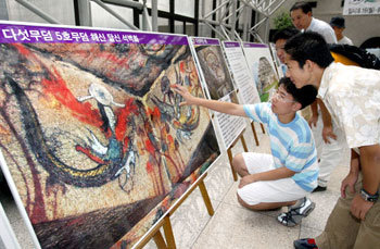 16日,在汉城永登浦区汝矣岛洞国会议员会馆第1层举行的高句丽遗址以及歪曲历史照片展中,学生们正在观看中国集安“5座古墓”内的高句丽古墓壁画中的“海神”和“月神”壁画照片并互相交谈着。